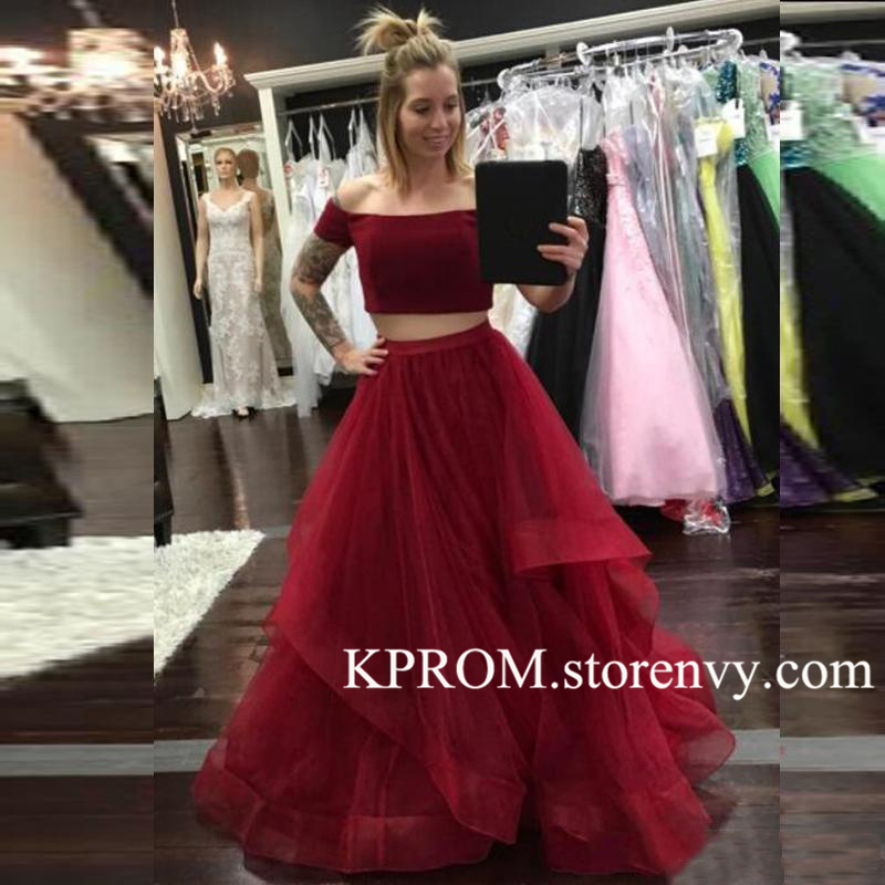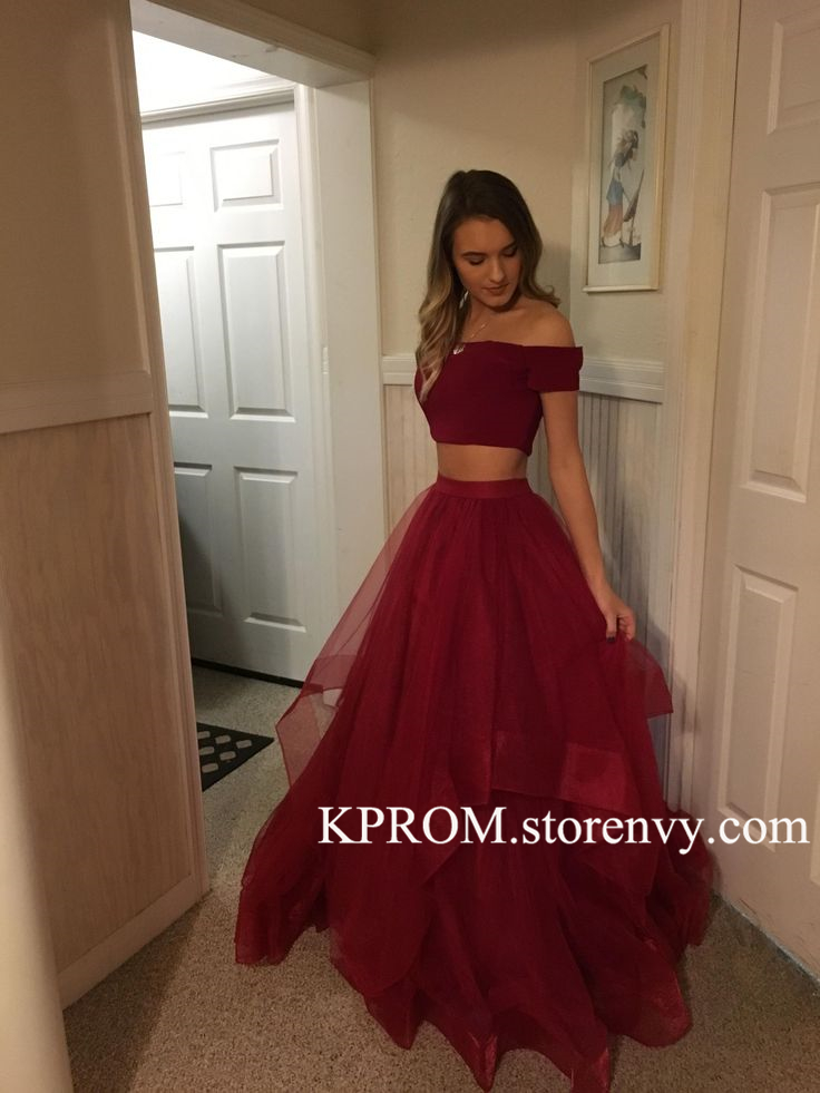 Two Pieces Prom Dress,Burgundy A Line Tulle Formal Dress,Long Party Gowns
