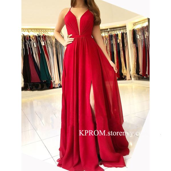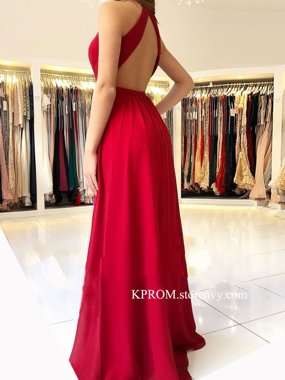 Sexy Red Halter Side Slit Long Evening Prom Dresses, Cheap Sweet 16 Dresses