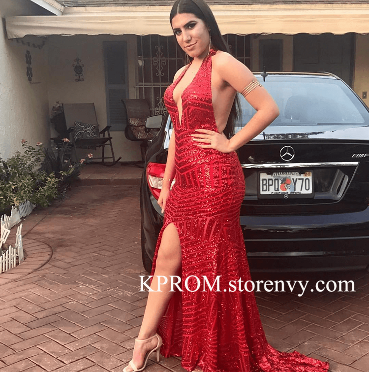 Sexy Long Sequin Prom Dress,Sparkly Deep V Neck Backless Sweep Train Evening Gown