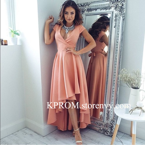 Stylish A-Line High Low V-Neck Cap Sleeves Long Prom/Homecoming Dress,Pink/Navy Blue Party Dresses