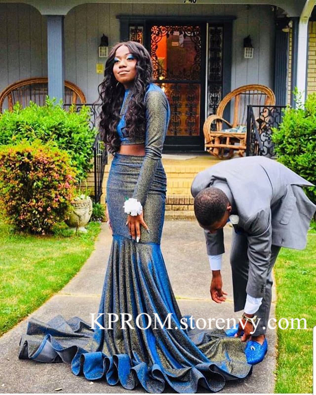 Sparkly Mermaid Prom Dress,Two Pieces Formal Dress for Women,Sexy Long Sleeve Prom Night