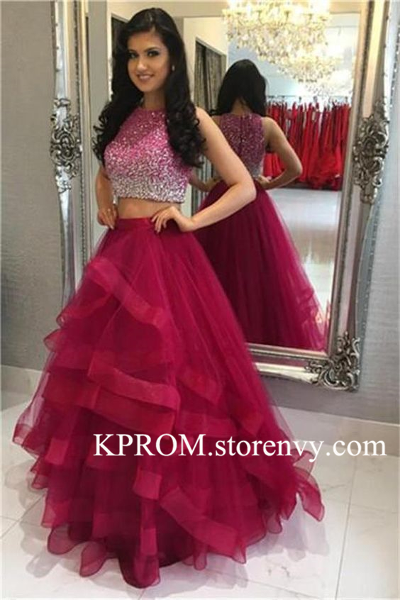 Two Pieces Beaded Crystal Prom Dresses,Tiered Tulle Formal Party Dress for Wedding,Long Prom Dresses for Women Custom Size