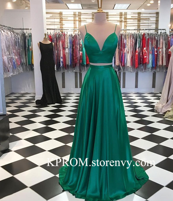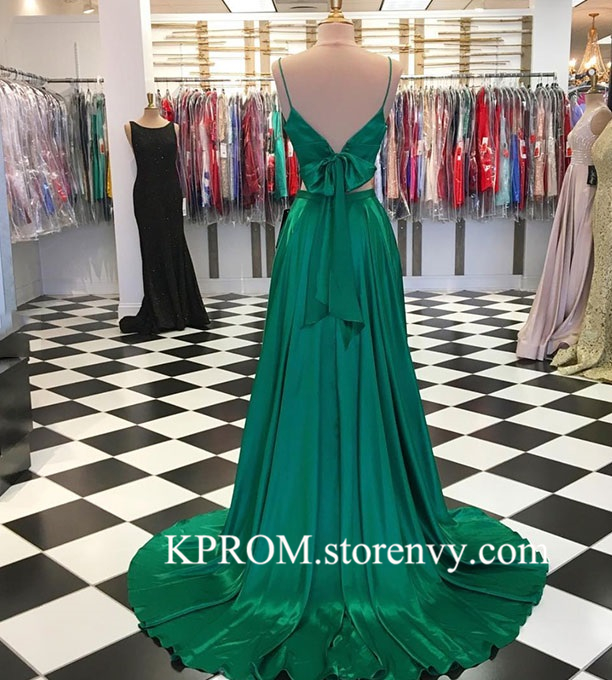 Two Pieces Green A Line Prom Dress,Stretch Satin V Neck Back Open Party Gown,Formal Dresses with Bow