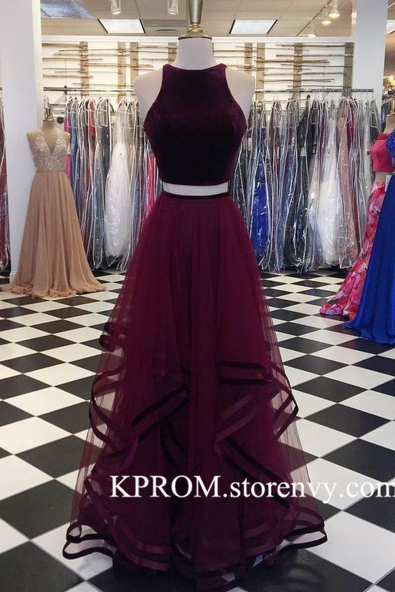 Charming Prom Dress,Sexy Two Piece Prom Dresses,Tulle Long Formal Dress,Burgundy Evening Dress