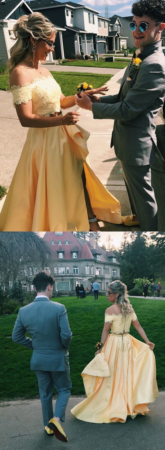 Two Piece Off the Shoulder White Long Prom Dress with Lace Applique, Red Formal Dress with Slit