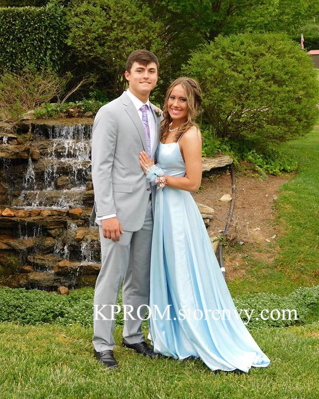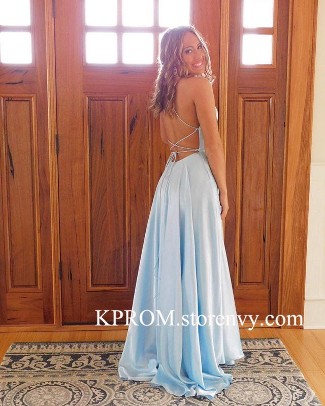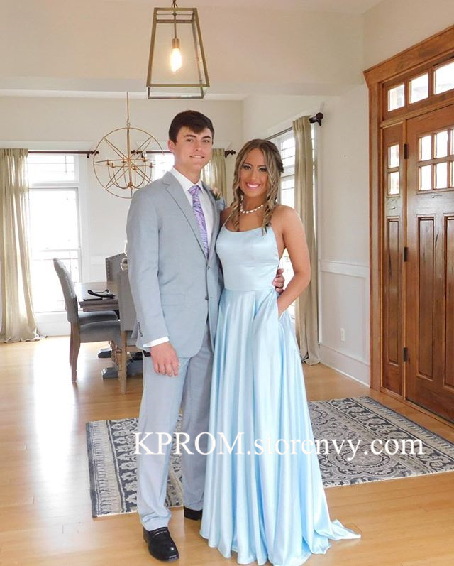 Elegant Light Blue Long Prom Dress with Open Back, Formal Dresses with Pocket,Evening Gowns