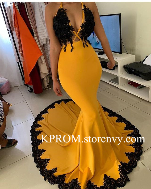 Sexy Orange Prom Dresses with Black Lace Applique,Back Open Long Mermaid Evening gown for Wedding