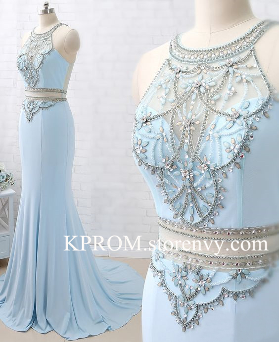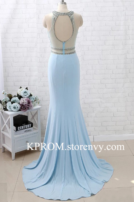 Luxury Two Piece Light Blue Mermaid Prom Dress,Crystal Beaded Evening gowns