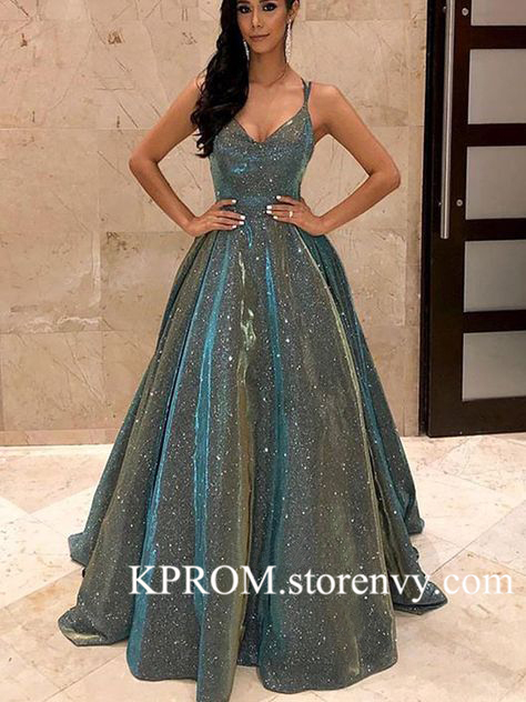 Fashion Ball Gown V Neck Sparkly Long Prom Dresses with Pockets,Cross Back Evening Dresses for Women
