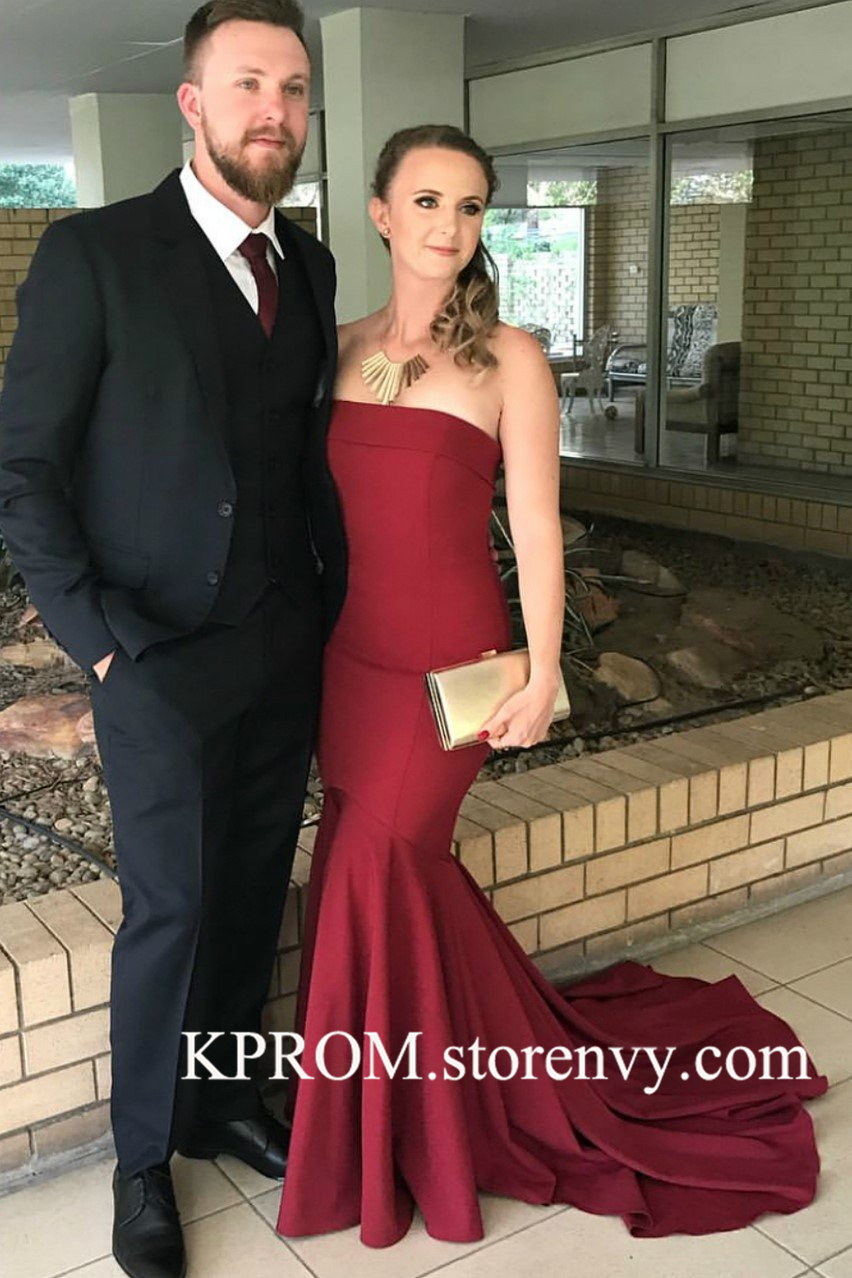 strapless mermaid style prom evening dresses with sweep train,Burgundy Prom dresses
