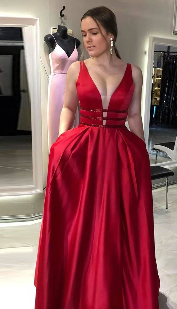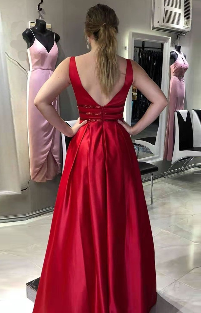 Red Prom Dresses Long Elegant,V Neck Satin Back Open Womens Evening Dresses