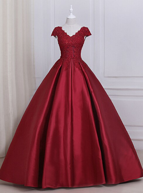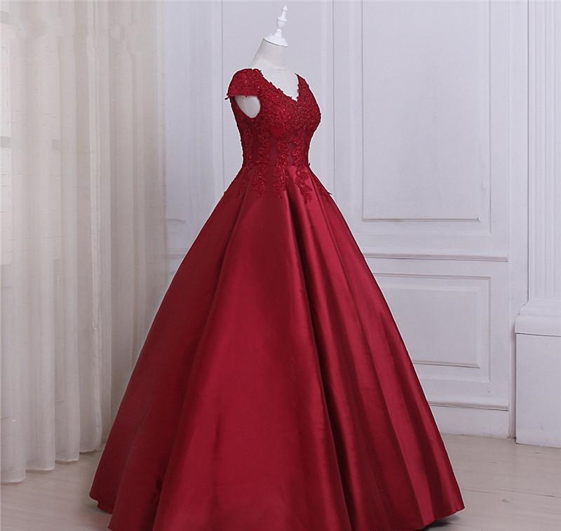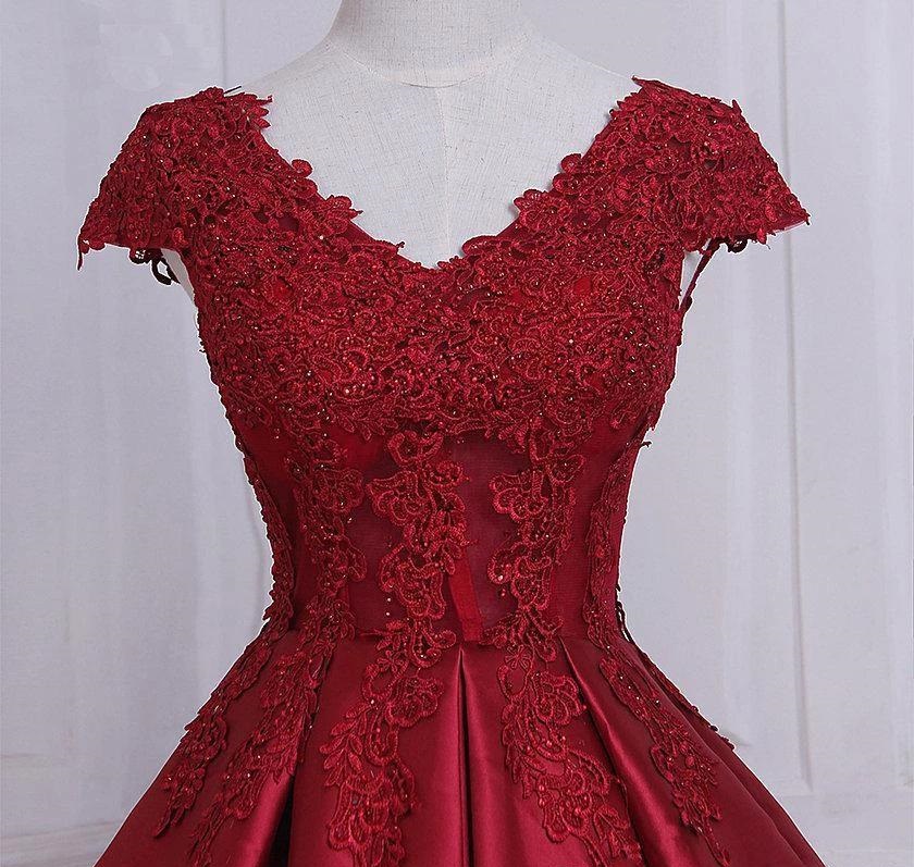 See Through Cap Sleeves Red Lace Ball Gown Long Evening Prom Dresses