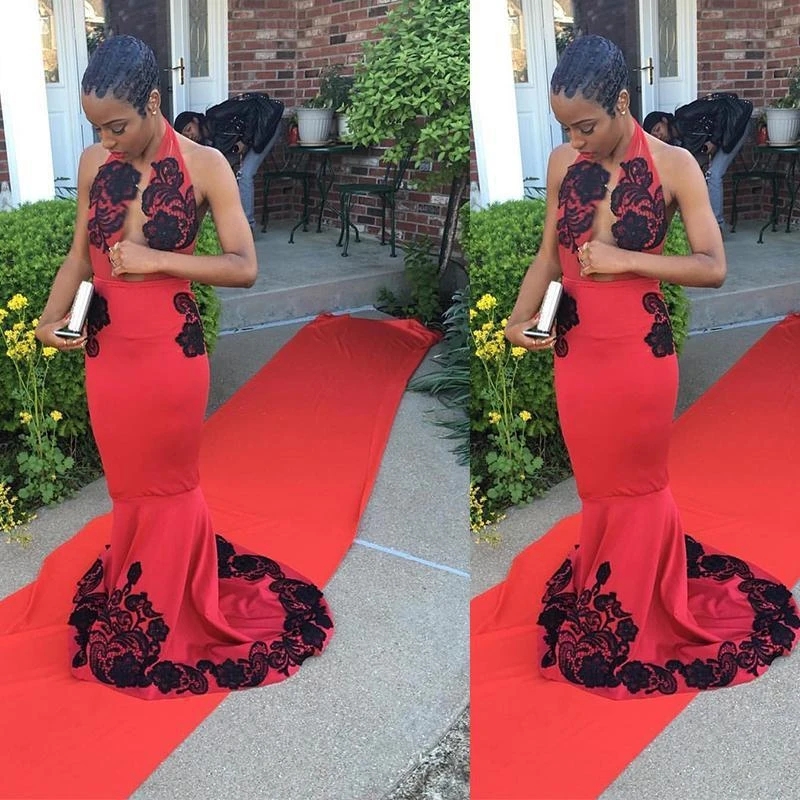 Long African Red Mermaid Halter Sleeveless Zipper Appliques Prom Dresses Sexy For Girls