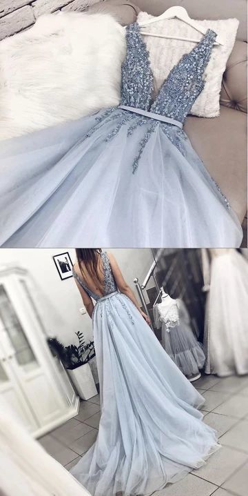 Fairy V Neck Backless Light Blue Appliques Long Prom Dresses,Elegant Evening Dresses