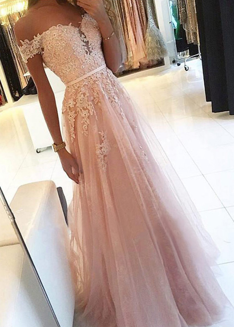 OFF THE SHOULDER A LINE PINK LACE APPLIQUES LONG FORMAL PROM DRESSES EVENING GRAD DRESS