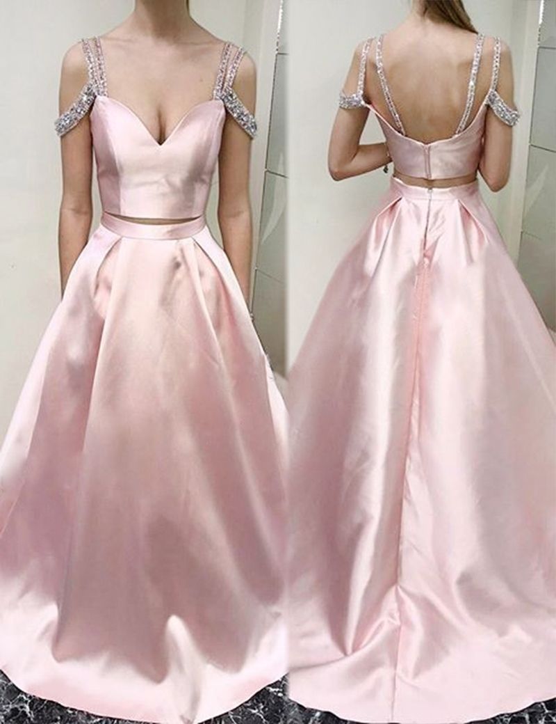 Two Piece Scoop Cold Shoulder Pink Floor-length Beading Prom Dress cheap prom dresses