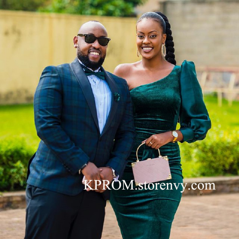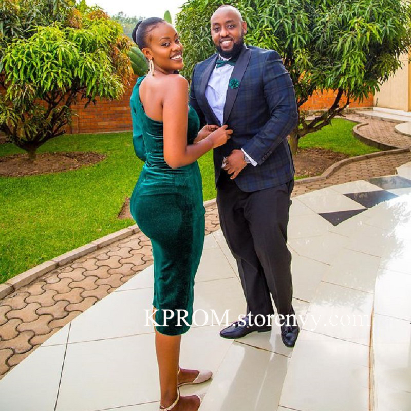 Green Velvet knee length party dresses One Shoulder Long Sleeve Black Girls evening gowns