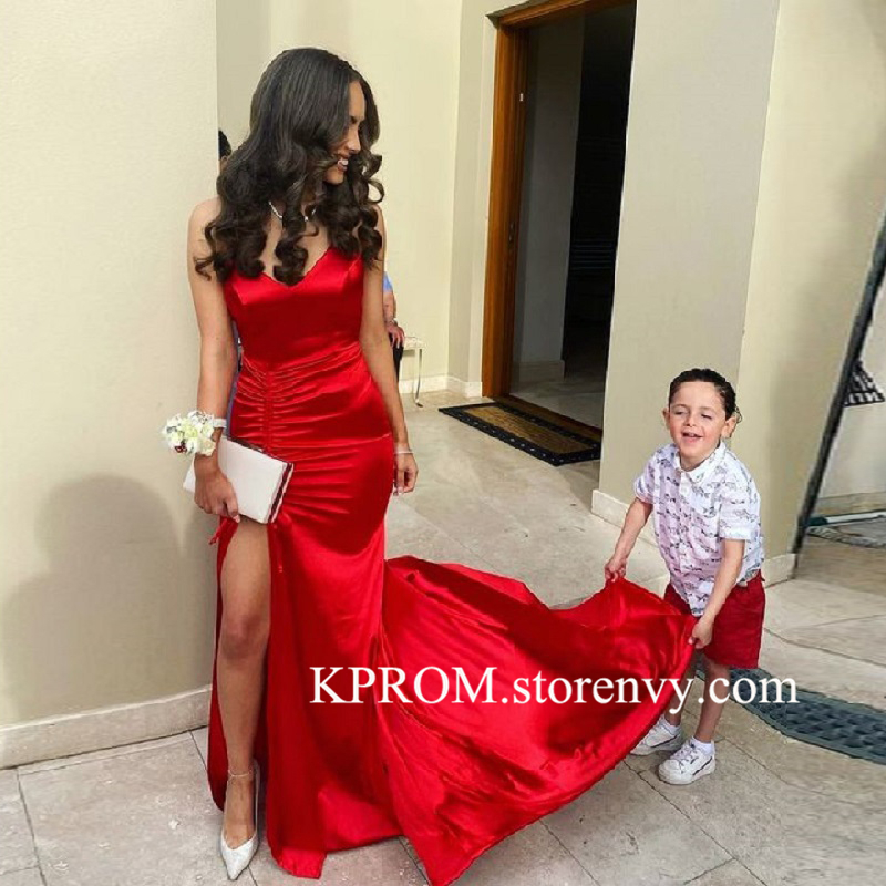 Beautiful Spaghetti Straps Open Backs Mermaid Red Prom Dresses with Slit,Long Evening Gown for women
