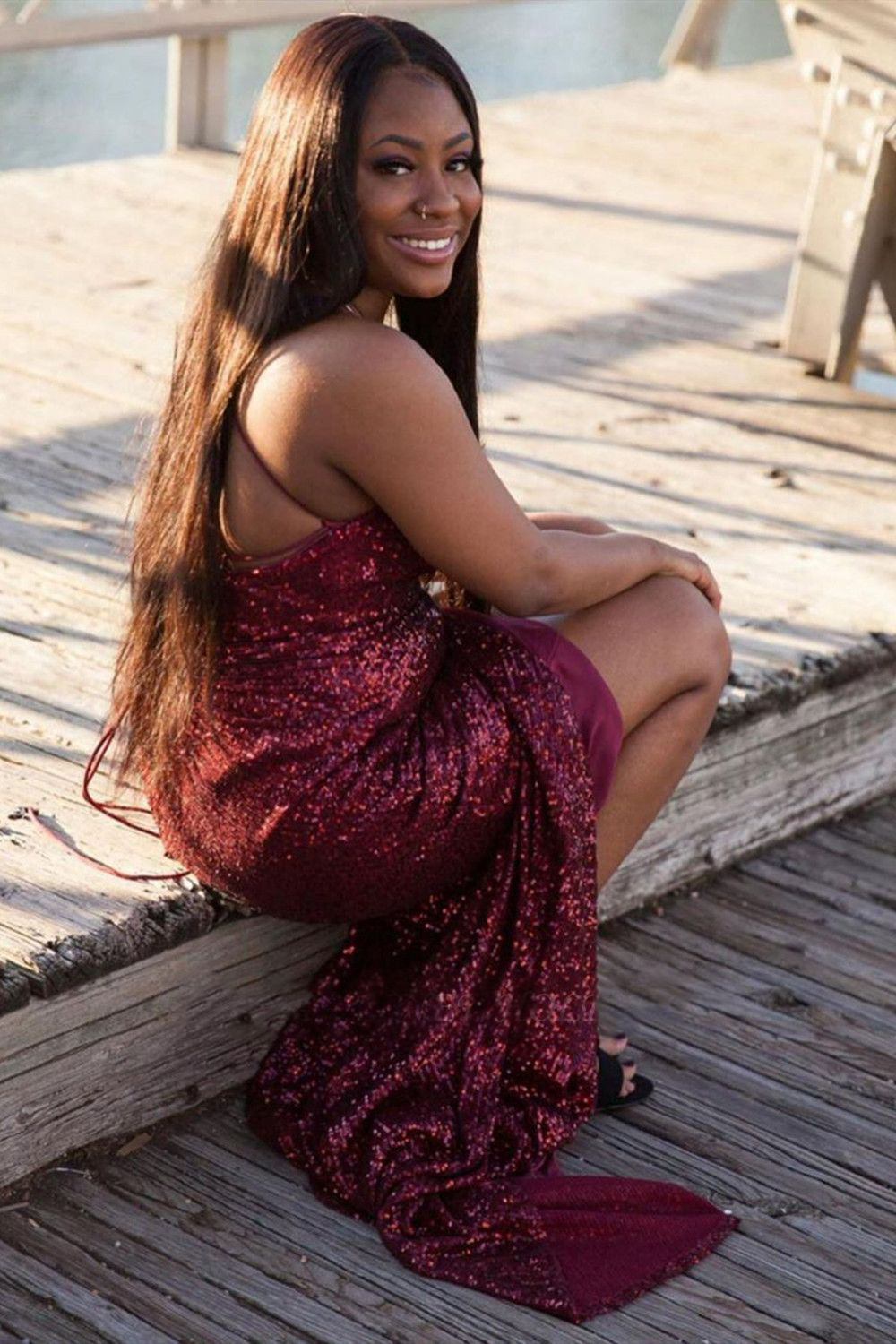 Burgundy Glitter Sequins Spaghetti Prom Party Dress Split front Formal Party Dress Graduation