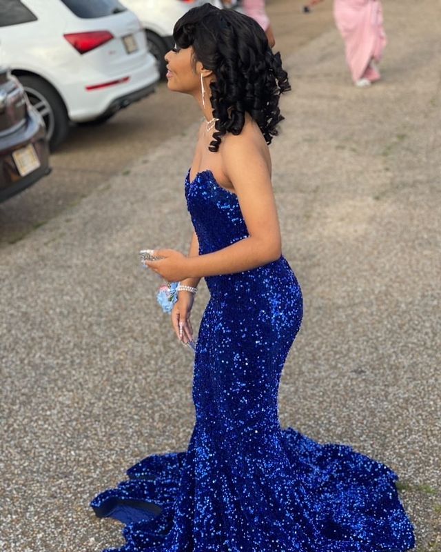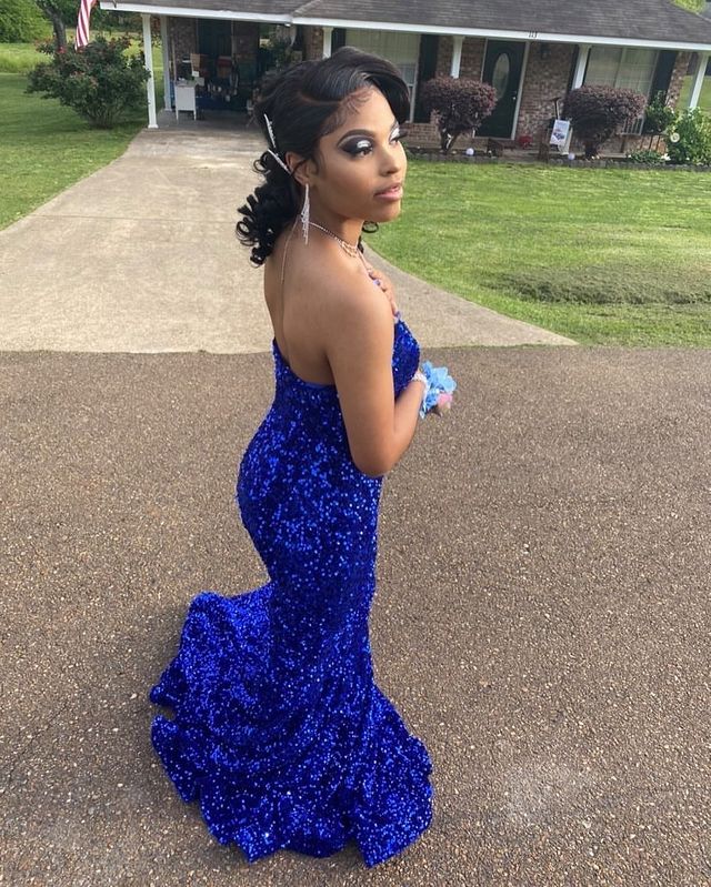 New Sparkly Long Royal Blue Sequined Prom Dresses Mermaid Open Back Formal Dress for Black Girls Gala Gown
