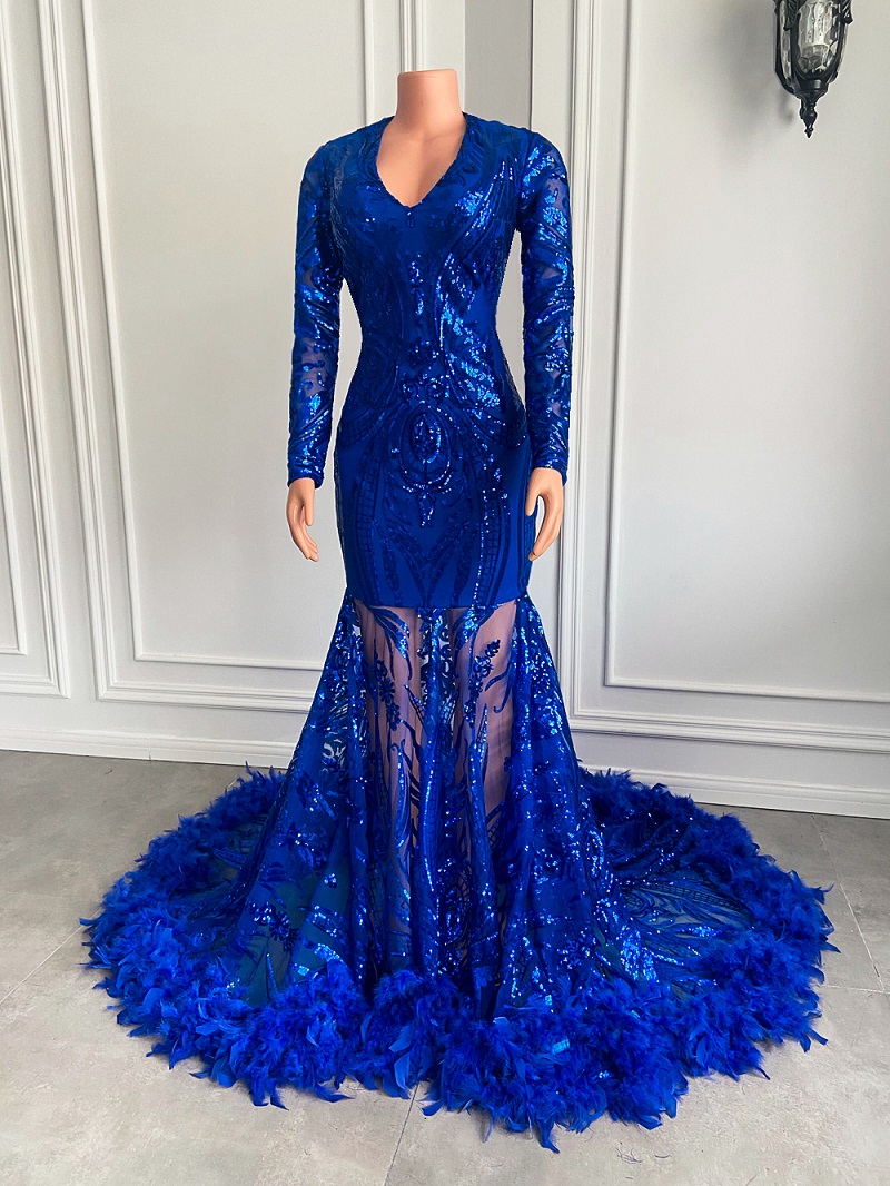 Luxury Long Sleeve Prom Dresses 2022 V-neck Mermaid Black Girls Royal Blue Sequined Feather Prom Gala Party Gowns