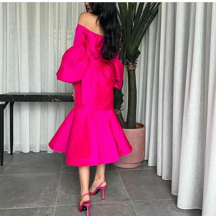Elegant Halter Taffeta Evening Dresses Puffy Sleeve Mermaid Fuchsia Tea Length Ruffle Prom Dresses for Women