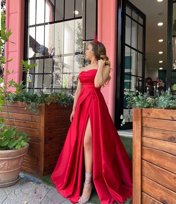 Elegant Red Long Prom Dresses with Slit,A Line Satin Formal Gowns Evening Dress