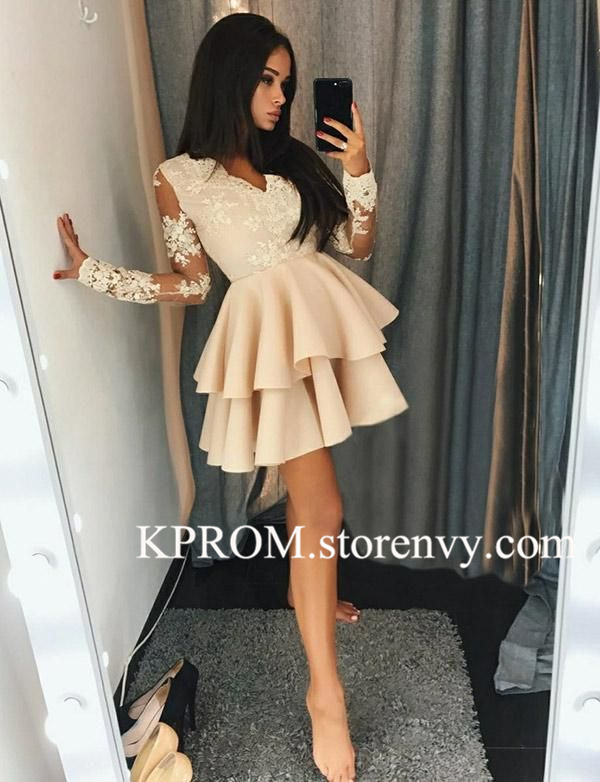 Lace Long Sleeves Short Cocktail Dress,V Neck Mini A line Party Gown,Prom Dress Custom Made