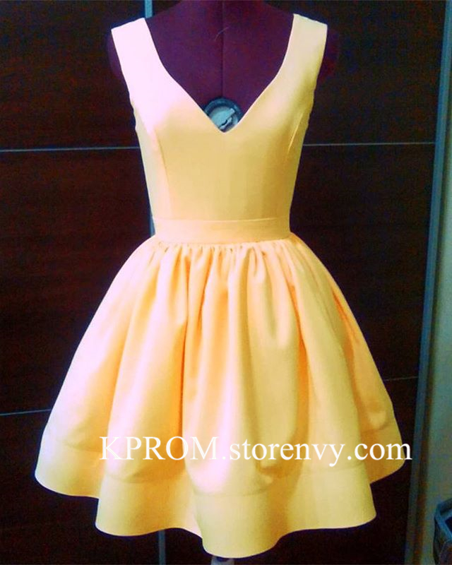 Ball Gown V Neck Short Satin Homecoming Dresses,Yellow Homecoming Dress