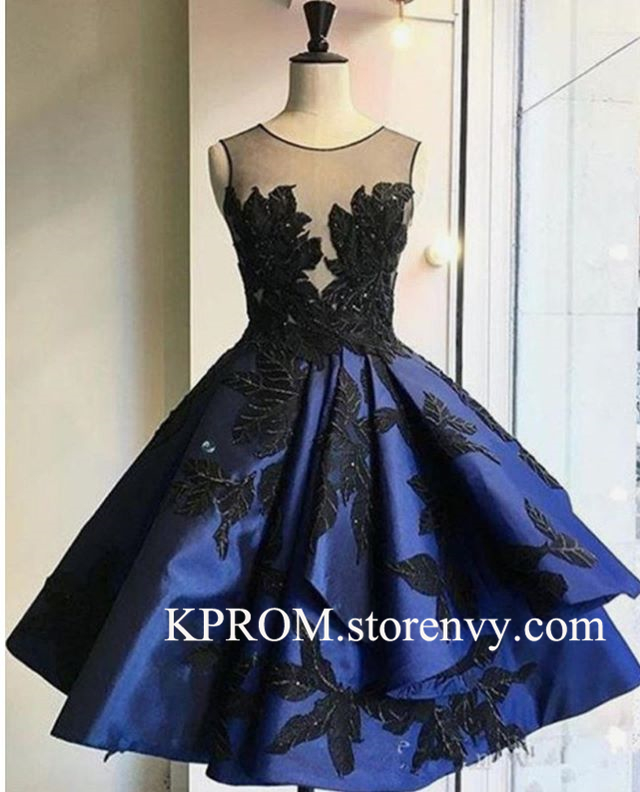 Modern A-Line Scoop Short Homecoming Dress With Black Appliques,Satin Hoco Dress,Party Gown Custom Size