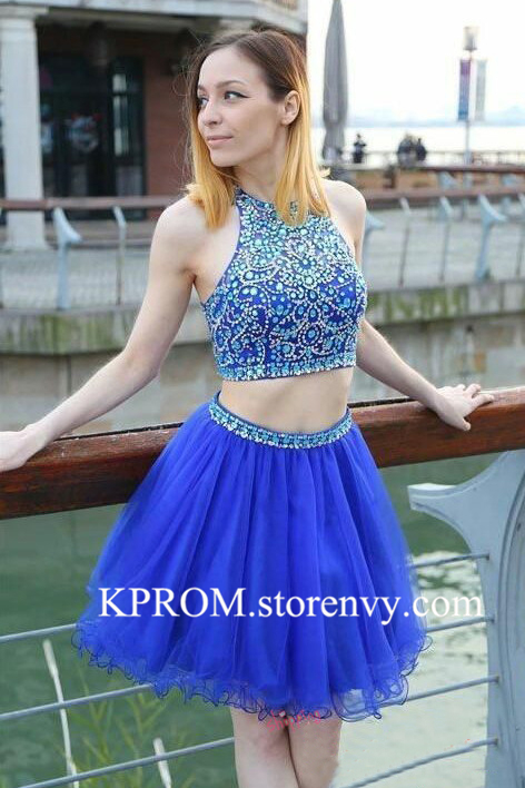 Two Piece Beading Blue Homecoming Dresses,Short A-line Tulle Sexy cocktail dresses