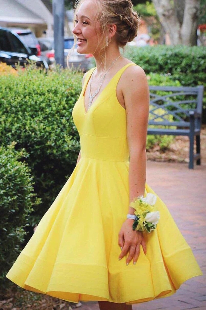 V-neckline Yellow Cocktail Dresses Short Satin Skirt Sleeveless Party