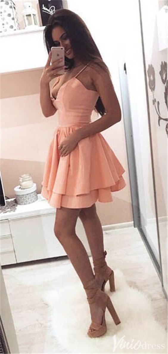 Short peach homecoming dresses V Neck Sleeveless graduation Ruffle party Gown