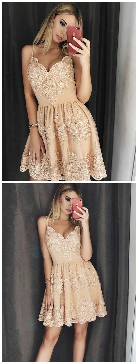 Elegant Spaghetti Straps V Neck Knee Length Lace Homecoming Dress