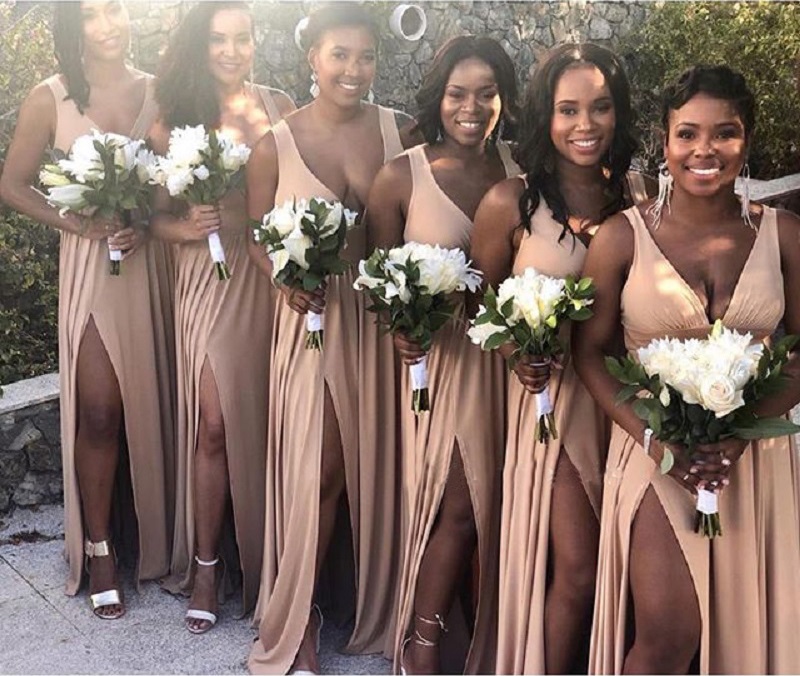 Gorgeous Stretch Satin Long Bridesmaid Dress with Slit,V Neck Sleeveless Party Gown for Weddings