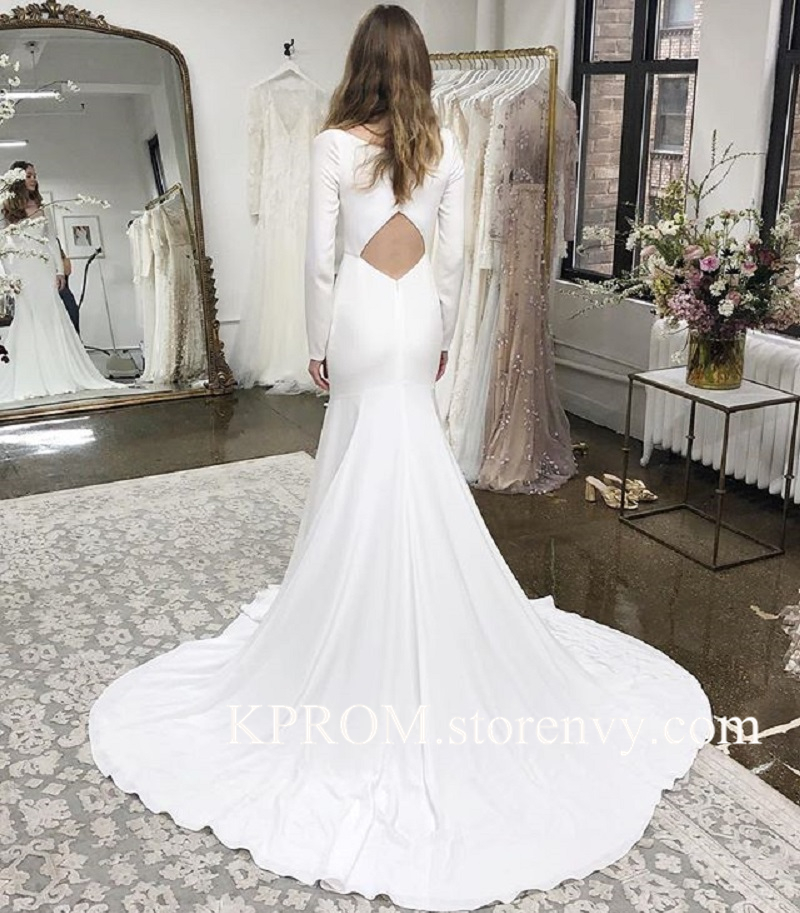 Charming Long Sleeve Stretch Satin Wedding Dress,Mermaid Sweep Train Wedding Dresses,Women Wedding Gowns