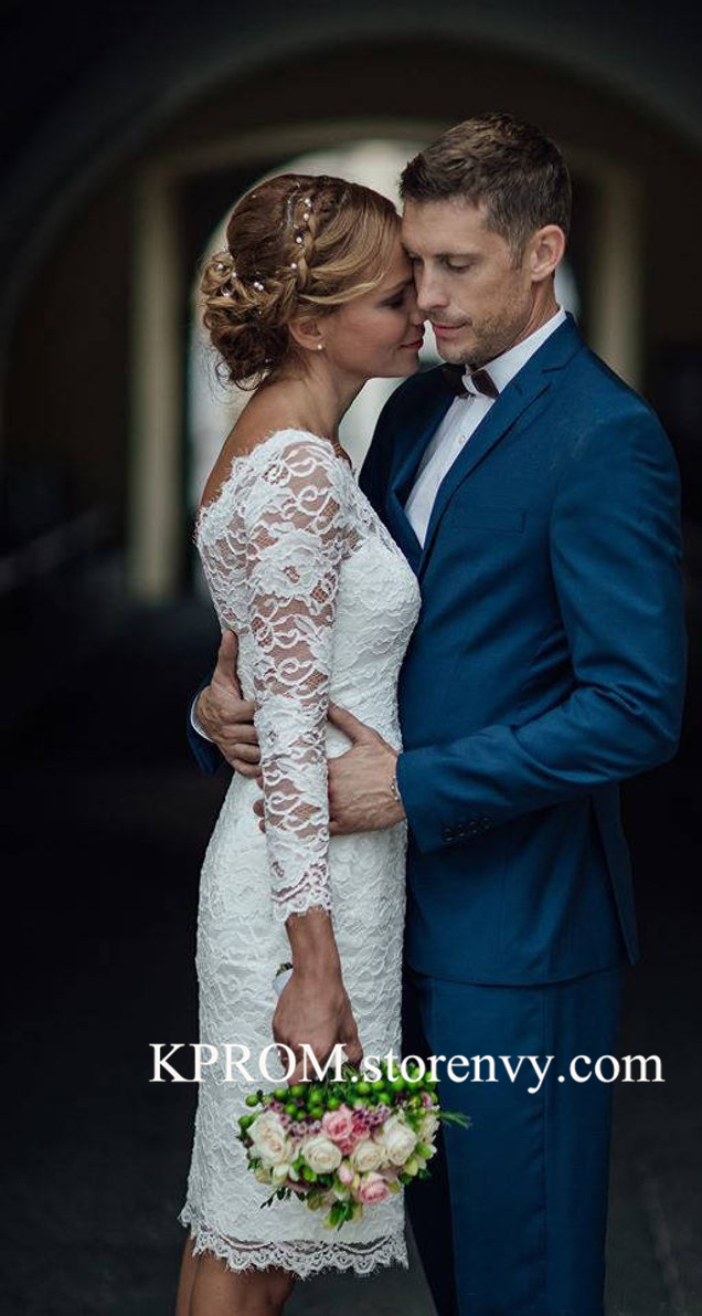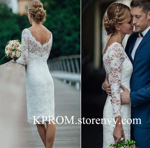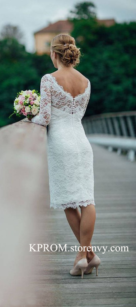 Knee Length Simple White Ivory Wedding Dress,Long Sleeves Lace Wedding Bridal Gown,Women Bridal Gowns