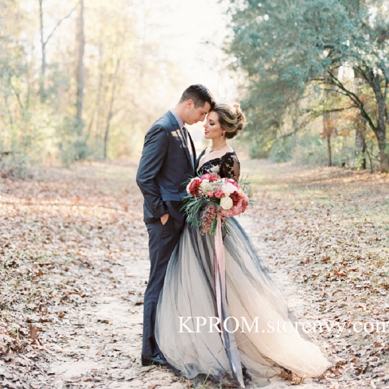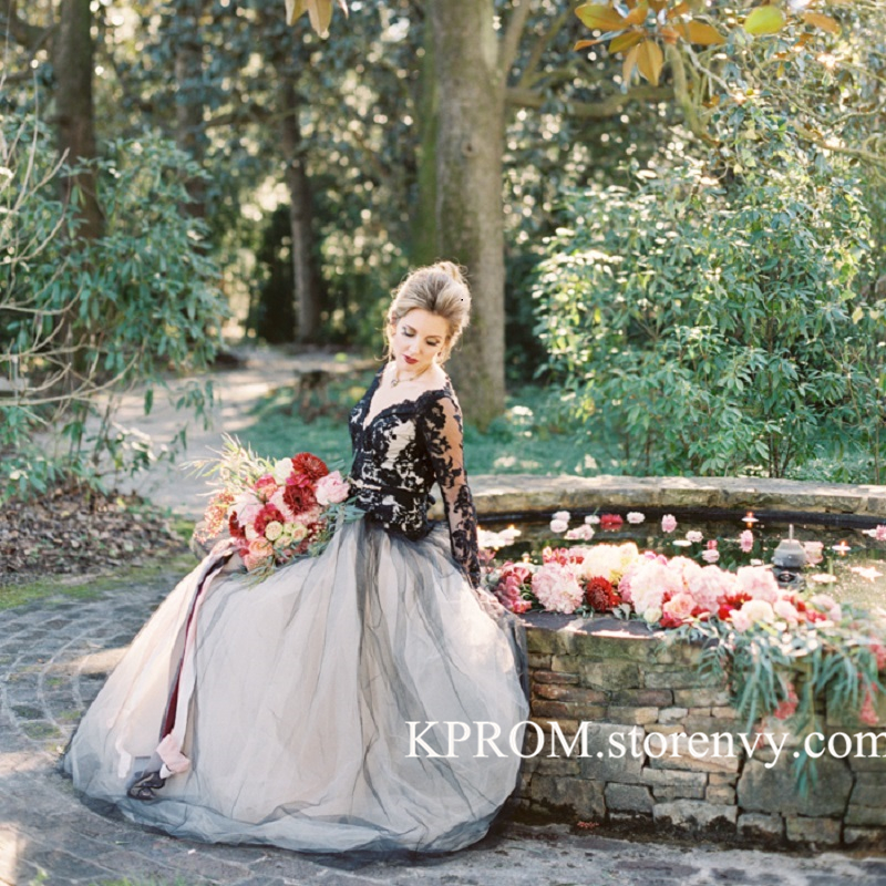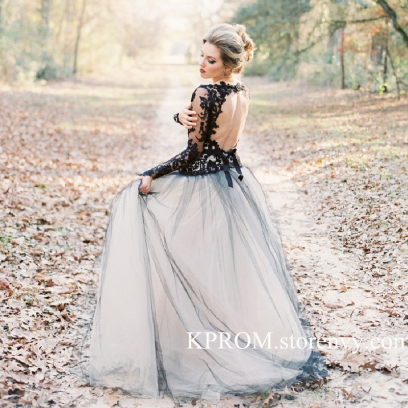 Gothic Black and White Wedding Dresses,Long Sleeve A Line Lace Bridal Dress,Back Open Wedding Gown