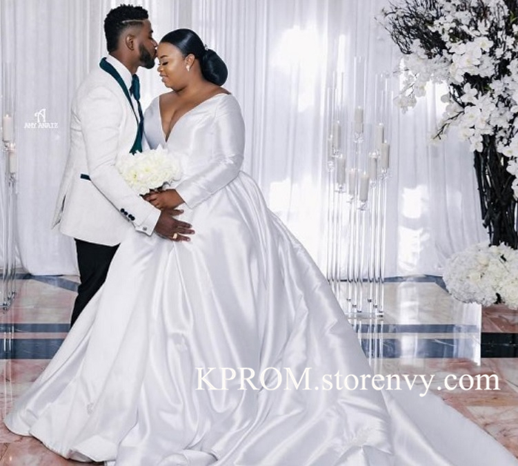 Long Ball Gown Plus Size Satin Wedding Dresses Bridal Gowns,Women Long Sleeve V Neck Bridal Dress Cheap Online
