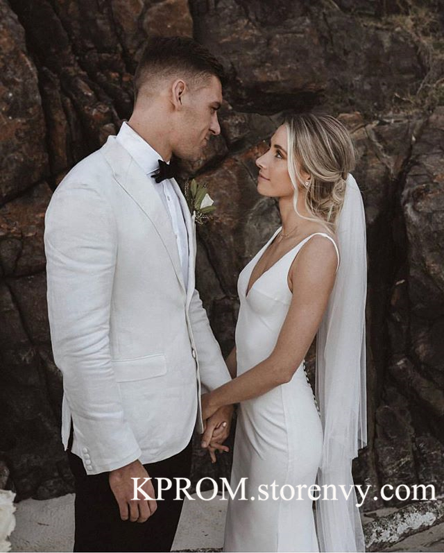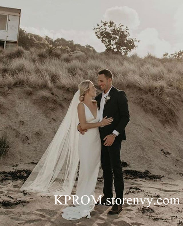Vintage V Neck Mermaid Wedding Dress,Backless Sweep Train Soft Satin White/Ivory Wedding Gown