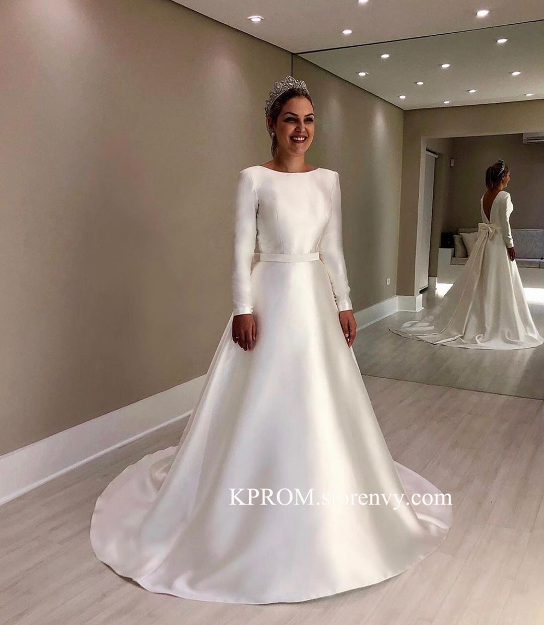 Simple elegant Long Wedding Dress,Backless a-line Satin Ball Gown Bridal Dress With Bow