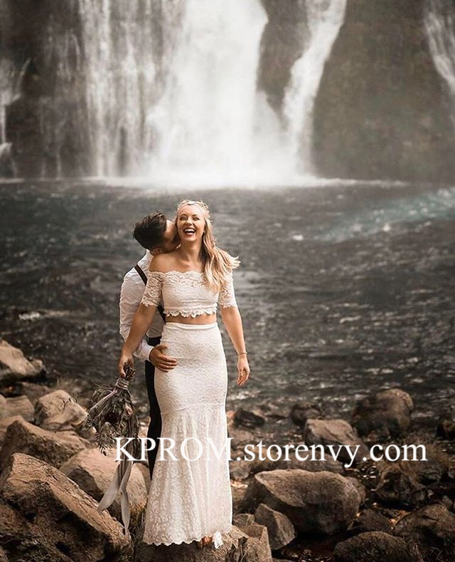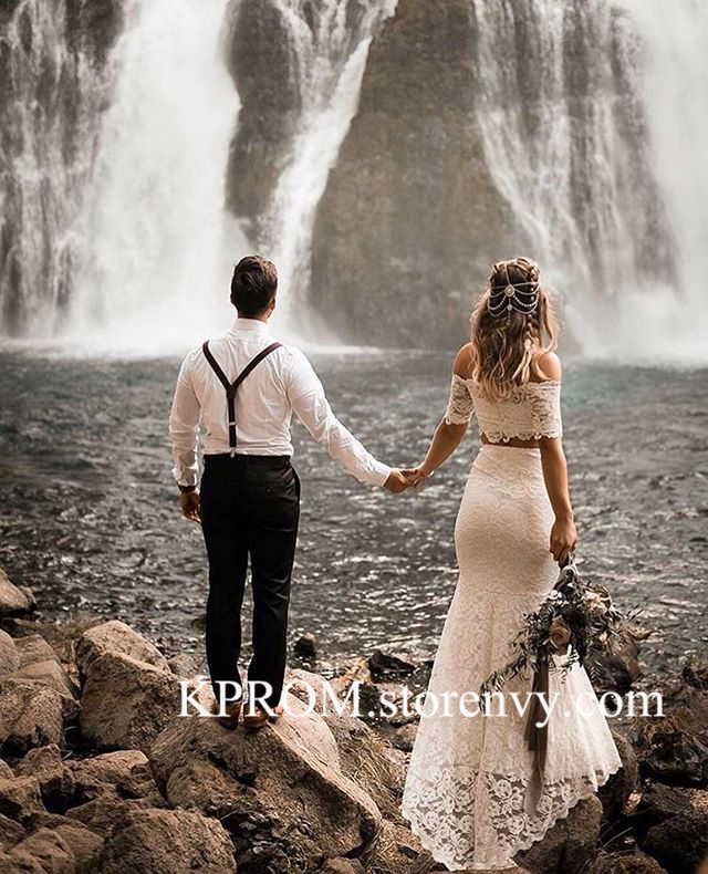 Sexy Lace Wedding Dresses,Two Pieces Boho Wedding Dress,Floor Length Mermaid Bridal Gown