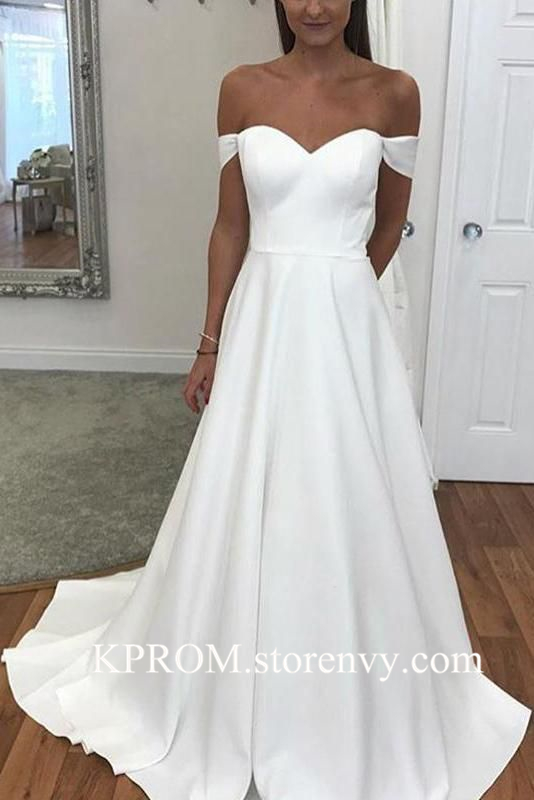 Simple elegant Long A-line Satin White Wedding Dresses,Off Shoulder Ivory Women Bridal Gowns Cheap