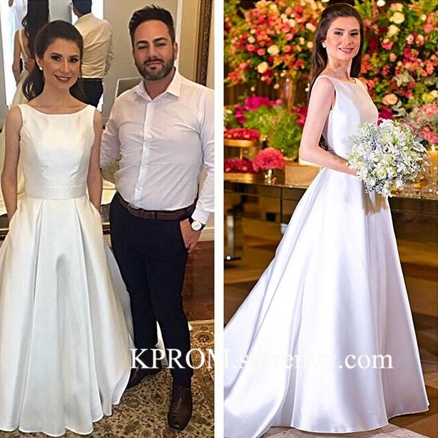 Simple A Line Satin White Wedding Dresses,Long Bridal Gowns with Pockets
