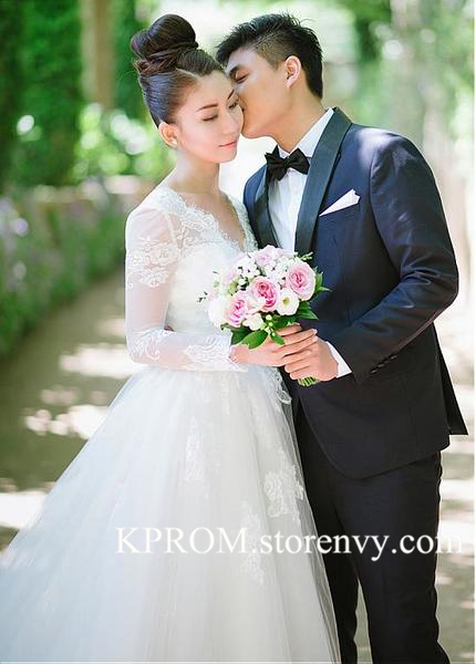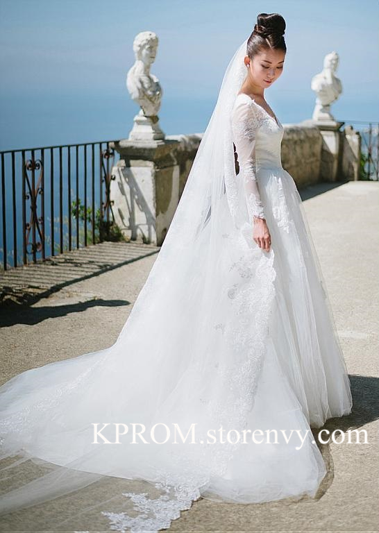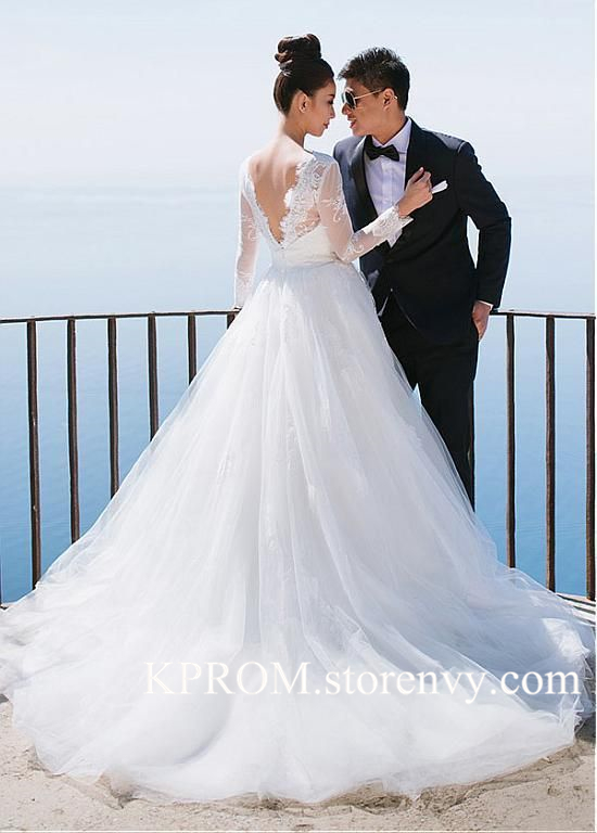 Long Sleeves V neck Lace Appliques A-line Beach Wedding Dress,White Bridal Gown