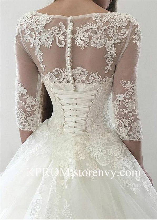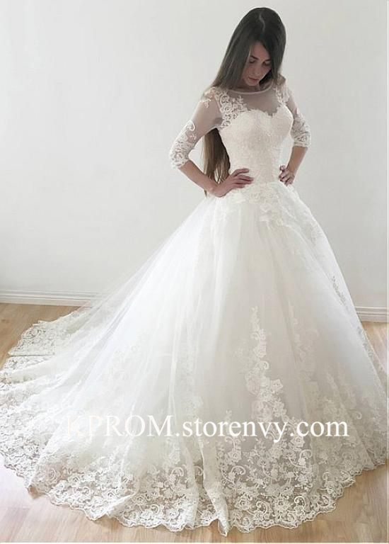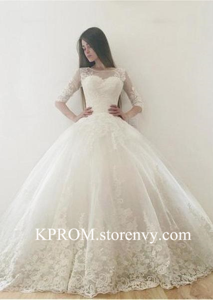 Lace Appliques Bateau Half Sleeves Ball Gown Wedding Dress with Train