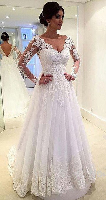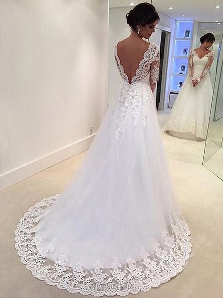 Classic A-line V-neck Tulle Sweep Train Appliques Lace Long Sleeve Backless Wedding Dresses
