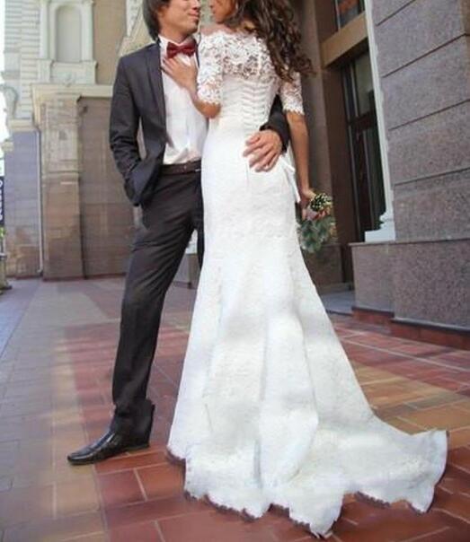 Trumpet/Mermaid Off-the-Shoulder 1/2 Sleeves Lace Sweep/Brush Train Wedding Dresses