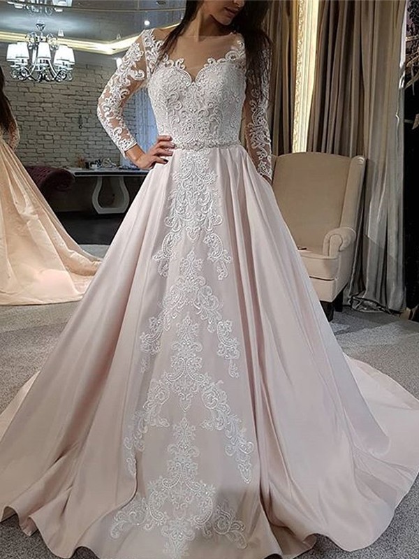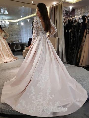 A-Line/Princess Satin Applique V-neck Long Sleeves Sweep/Brush Train Wedding Dresses