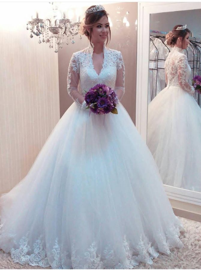 Ball Gown Tulle Applique High Neck Long Sleeves Sweep/Brush Train Wedding Dresses